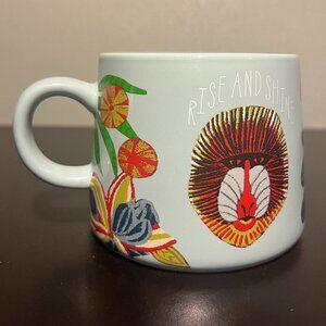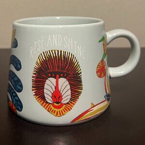 Delightful graphics of a baboon face and whimsical jungle plants against a pale green background adorn both sides of this porcelain mug from Opalhouse. White text above the baboon reads, Rise and Shine. The mug has a nice heave feel to it. Microwave and dishwasher safe. Measures 3.5” tall with a 3.5” diameter; 4.25’ at the base; 5.25” across including handle. Holds 16 fluid oz. From Opalhouse.