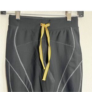 These black OPEDIX women's 3/4 length action pants offer full compression including knee action. These attractive pants are black with white stitching and has a small pop of color with the yellow striped waist ties. Great for skiing, running or the gym, these pants are not only attractive but supportive. OPEDIX has worked with specialists to create active wear geared for health and ultimate performance.