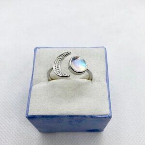 Open 925 silver filled textured crescent moon and round faux moonstone ring. The stone catches different colors in the light. Stamped S925 (stamp too small to photograph). Size can be adjusted. Ring is a standard size 8 that can be adjusted to fit most ring sizes. Will come in a mini plastic bag. Ring box not included.