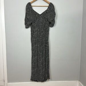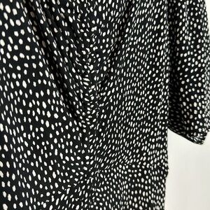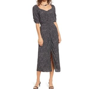Beautiful brushed dot midi dress with ruchodetails on the sleeves and front center. This dress ruches at the front center and has a front slit. The 3/4 length puff sleeves have ricin the sides. Elasticized sweetheart neckline. 100% viscose.