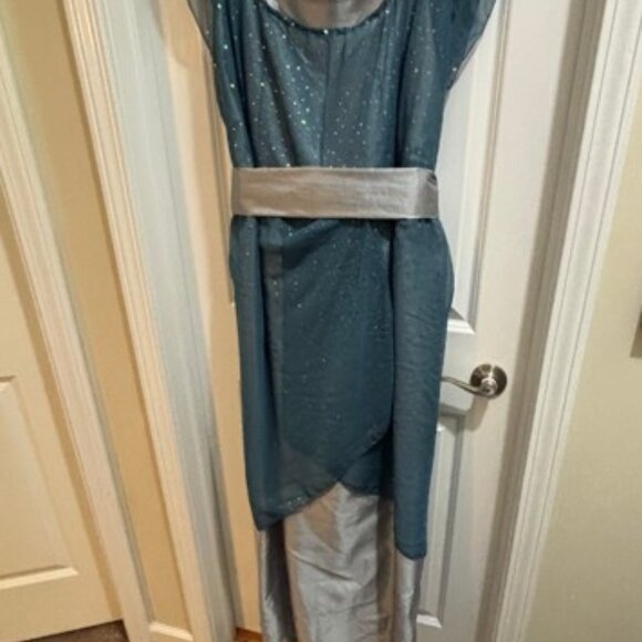 Silver dress with a teal overlay, combination of machine and hand stitched Plus sized - I never went past a Size 22, there is a purse and a silver pair of size 9 shoes (if wanted). The pictures really do show all the details