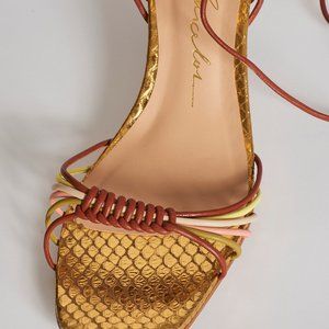 OPEN TOE SHORT HEEL WRAP GOLD AND BROWN SANDALS WITH MULTI-COLOR TASSELS