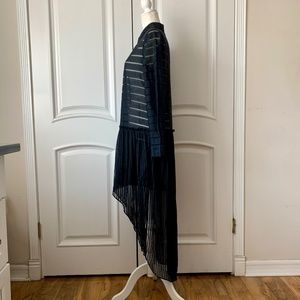 OPENING CEREMONY SHEER STRIPED ASYMMETRIC BLACK SHIRTDRESS. Asymmetrical mini front and midi back, long sleeves with button cuffs, size large. Pointed collar, pleated accents, drop waist at skirt with button closures at front. Cotton blended, sheer fabric features horizontal and vertical striped pattern. Gently worn, the fabric at the top right shoulder shows slight stress spot caused by wooden clothes hangers, see pics. Good Condition!