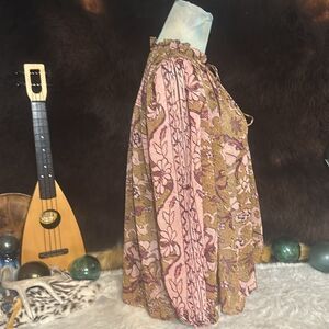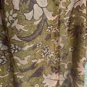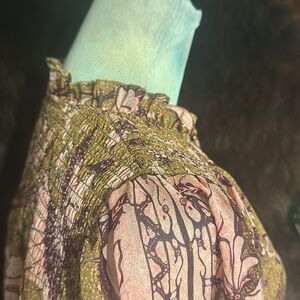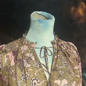 This semi sheer blouse is an excellent condition and measures 22 inches pit to pit. It’s approximately 24 inches long and has gold shimmer dots throughout the blouse.
