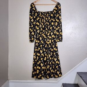 Elegant black dress with vibrant yellow floral patterns. Perfect for any occasion.
