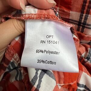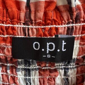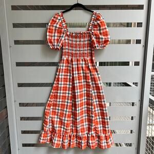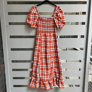 o.p.t orange and white plaid picnic prairie square neck maxi dress. Short puff sleeves with smocked bodice and loose silhouette with ruffle hem. Unlined. In excellent condition. Size small - 13" pit to pit and waist; 39" length from pit, 48" total length.