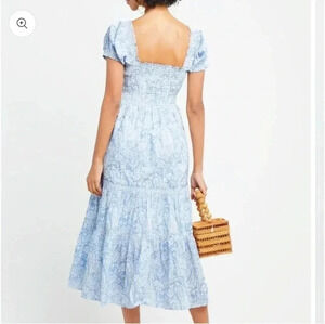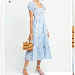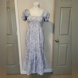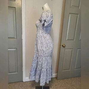 O.P.T. Square Neckline Smocked Blue/White Paisley Print Cotton Maxi Dress(M)