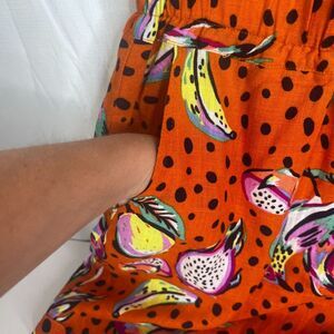 Orange with black polka dots and yellow fruit and bird print