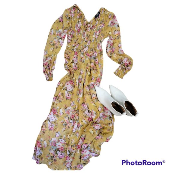 O.P.T Wick Smocked Crinkled Chiffon Romantic Floral Midi dress, size medium