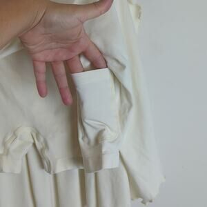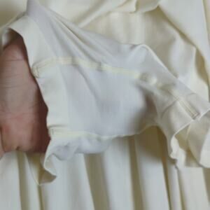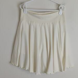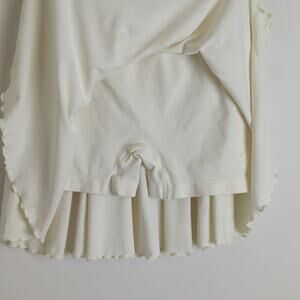 like new! cream nylon/spandex soft stretch material . Shorts have a side left pocket hidden by skirt .