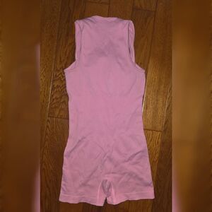 pink, square neck, sleeveless, romper, casual, fitted, stretchy, summer, minimal, trendy