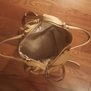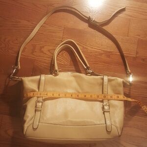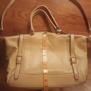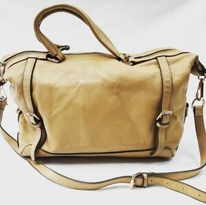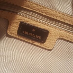 ORA DELPHNE leather satchel. Beautiful soft leather. On the inside you will find one zipped pocket and two small pocket. Zipper pocket also on the outside back of the bag. Removable and adjustable long strap. No major stains, but it can be clean with leather cleaner. Dust bag not available. <13>