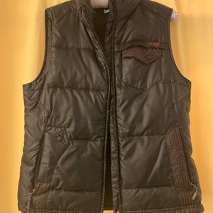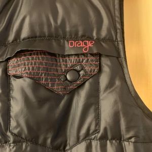 Orage black ski vest size lg excellent condition, no flaws. Orage has been making ski wear for 25 years. This vest has red accent stitching on the pockets and the left chest. Exterior 100% nylon designed to withstand winter elements while maintaining street fashion, interior 100% polyester--Orage apparel is designed to keep you warm, dry, comfortable and most importantly looking like no one else! armpit to armpit 20", length 24"