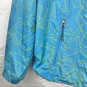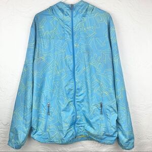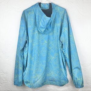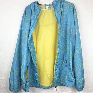 ORAGE light blue hooded snowboarding windbreaker with yellow “orage” overall spell out