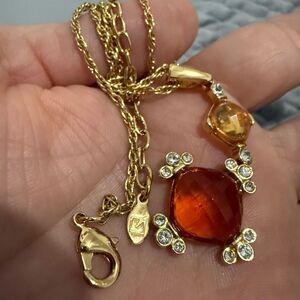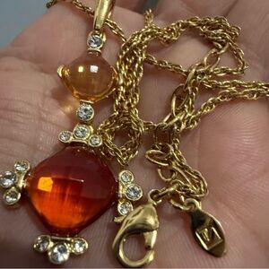 A golden glow with vintage soul ✨ This enchanting necklace features a detailed drop pendant with two captivating gemstones: a warm amber-toned cabochon and a faceted orange crystal that shimmers like fire. The gold setting is delicately accented with brilliant clear rhinestones, creating a regal, antique-inspired vibe. Hung from a twisted rope chain with a lobster clasp, this piece is perfect for layering or letting it shine solo.