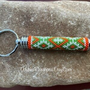 Here’s a Orange , Green and White Hidden Compartment Keychain made with high quality glass Delica Beads, beaded one bead at a time. Love and passion goes into making my jewelry. This process requires focus, patience and dedication. Each bead is 16th of an inch and can take hours to complete a project.