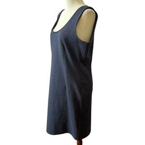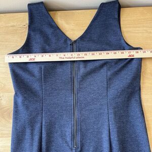 Womens size Large, heather blue color, sleeveless, round neckline, back v-neck with back zip closure, back of knee vent, sheath silhouette.