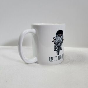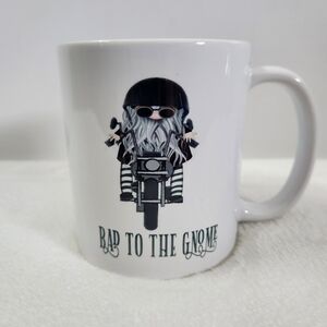 Orca Coatings Bad To The Gnome White Coffee Cup Mug. 11 oz, double-sided images, black & gray biker gnome on a motorcycle, "Bad To The Gnome" in green lettering. No cracks, chips or stains. Like new condition!