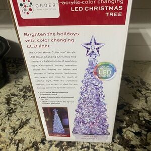 Brighten your festivities with the ORDER Home Collection LED Holiday Tree. This elegant decoration features a clear design with color-changing LED lights, perfect for adding a magical touch to your home. 12” tall battery operated. Box is a little damaged from storage but the tree is perfect