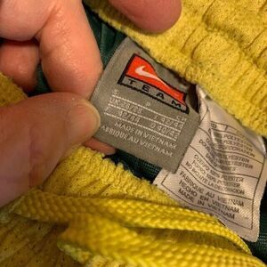 OREGON DUCKS SIZE SMALL NIKE TEAM SHORTS. ELASTIC WAIST WITH DRAWSTRING, POLYESTER, POCKETS, 23" LONG, 10" LONG.