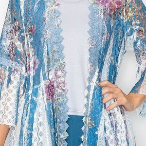 ORIGAMI DESIGNER duster cardigan kimono wrap BLUE FLORAL all lace SM-4X BOHEMIAN