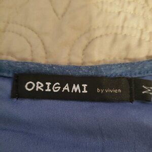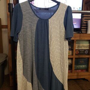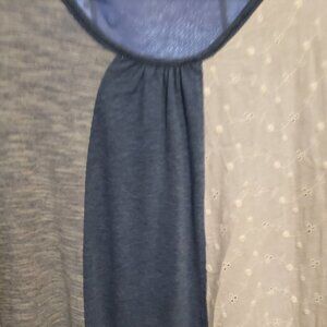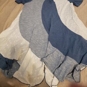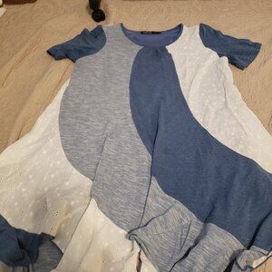 Origami by Vivien Mixed Media Dress-Size Medium. Blue/Blue Heather/Cream Eyelet. Hankerchief/Petal hemline. Measurements taken with garment laying flat - Across the chest - 19" / 36" Length