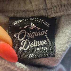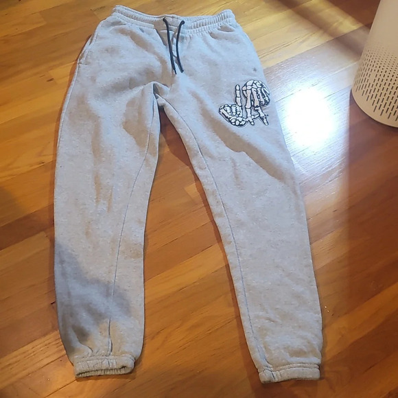 EUC, ORIGINAL DELUXE SUPPLY Grey gray skeleton hands forming LA sweatpants joggers medium elastic waist w drawstring, elastic leg cuffs. Measures approx 26-34 (elastic) waist 29" inseam. 2 side pockets, one patch pocket. Check out our closet and bundle to save 💵bundles over 5 lbs will require purchase of extra postage. Offers always welcome 😊Non-smoking cat friendly home 😻Bookmark our closet as new items added weekly 💕thank you for shopping our closet.