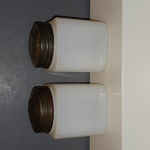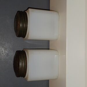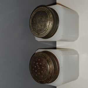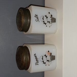 ORIGINAL Vintage Art Deco Milk Glass Basket Bouquet Salt & Pepper Shaker Set. Decals are a tad faded but would still make an excellent addition to any collection. Corners have a ribbed column design. Each shaker measures 3" x 2" x 2". Beware of sellers passing off shakers with reproduced decals!!! Packaged to arrive safely to their new home. Comes from a smoke-free environment.