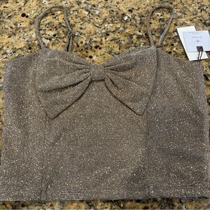 Add a touch of elegance to your wardrobe with this stunning Creative brand shimmer bow crop top. The slim fit and cropped style make it perfect for a night out or a special occasion., or wear with jeans for a more casual look. The adjustable strap design ensure a comfortable fit while the V-neckline adds a touch of sophistication.