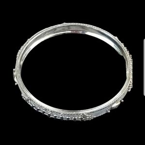 Beautiful silvertoned brass metal bangle bracelet is very detailed with mesh designed outside and silvertoned designs with black bead detail. Bracelet has a 9 inch circumference.