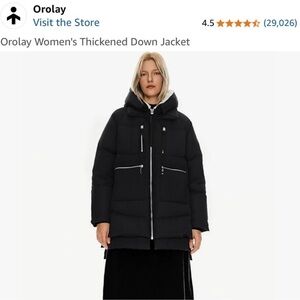 Chic and cozy puffer coat by OLAY. Features a sleek black design with orange lining. Ideal for cold weather.