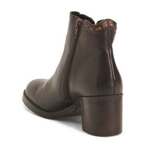 Brand New Color: Dark Brown stitch trim, braided detail, stacked block heel, grip sole, size chart conversion may vary slightly by country 2.5in. heel ankle boots 4.5in. shaft height, 10in. shaft circumference, taken from size 37 rounded toe, side zip closure leather upper, man made sole imported, made in Italy