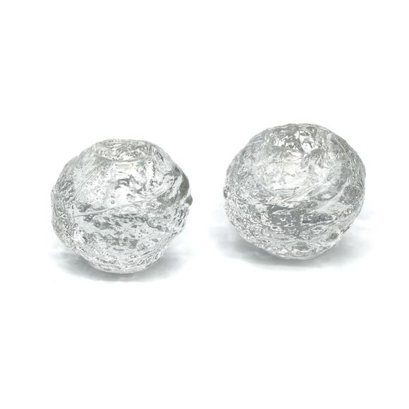 Orrefors Kosta Boda Crystal Large Snowball Tealight Candle Holders, Set of 2. Very heavy and well made! Heavily textured exterior. Perfect home accent. Transparent crystal glass, with refracted rainbow when held up to the light.