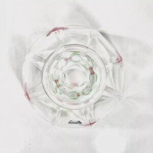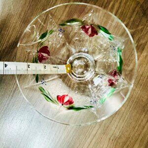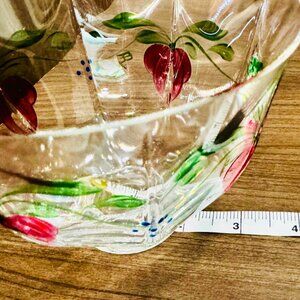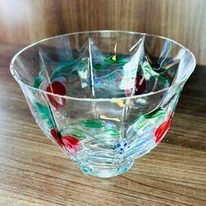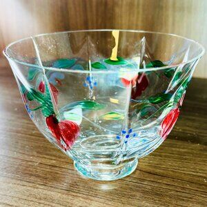 The "Maja" footed handblown glass bowl by Orrefors Sweden was introduced in 1987. The bowl has a faceted shape with hand-painted pale red flowers and delicate green vines with a few blue dots to represent berries. The initials "EE AL" are hand painted subtly on the bowl, the signature of designer Eva Englund and painter Arne Lindblom.