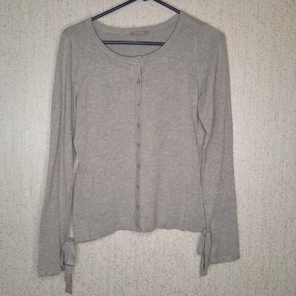 Super cute cardigan by Orsay. Tiny raised dot texture on bodice with ties/bows at the bottom of the sleeves. Feminine.