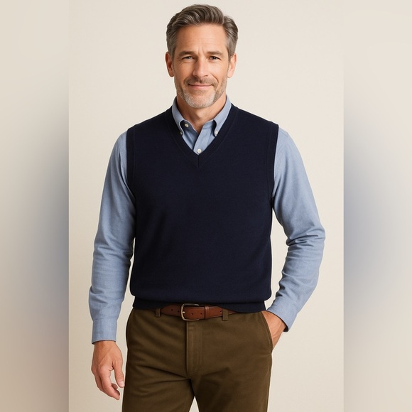 Classic Orvis 100% Merino Wool sweater vest in a deep navy blue. Timeless and versatile layering piece — perfect for pairing with button-downs, flannels, or crewneck tees for a polished, elevated look. Soft, warm, and breathable.