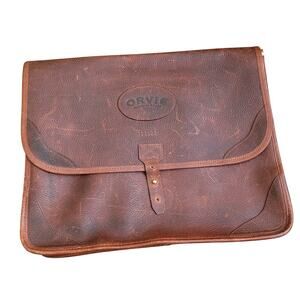 This ORVIS Bullhide Bag is the perfect choice for your travel needs. With a spacious interior and multiple pockets, this vintage-inspired bag is large enough to carry all of your portfolio belongings. The exterior is made of thick brown leather with a solid pattern, while the interior is lined with durable nylon. The bag features closures Buckle snap. This bag is a limited edition piece and is suitable for travel, casual, and business occasions. It is preowned with some scuffs and marks. Some of the brass hardware has light tarnish marks. Initials BEH Embossed.