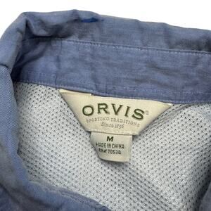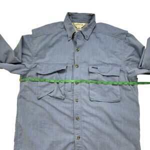 ORVIS Chambray Blue Outdoor Button Up Shirt. Size Medium Mens. Plenty of pockets for a multitude of outdoor activities — fishing, hiking, camping. Cotton-nylon blend for quick dry. Small snag on one wrist, light discoloration on the inside of the collar (see photos). In otherwise excellent condition — no rips or holes. Retail: $98.