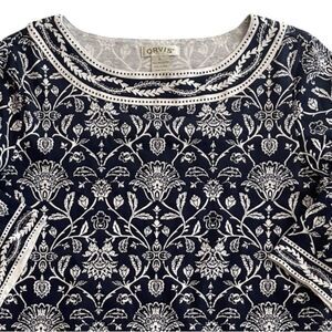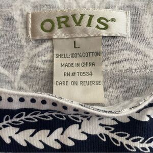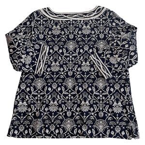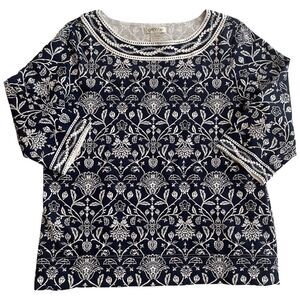 Orvis Damask Jacquard Floral Top in blue & white. Features a boat neckline, 3/4 length sleeves, slight notched sides. Pullover style. Very gently worn with no obvious flaws. Size large. Approximate measurements lying flat: 21.5” from pit to pit & 25.75” from shoulder to hem. Bundle to save big!