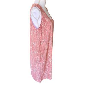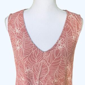 Beautiful pink color background fabric with white floral and leaves. Super comfy classic sleeveless dress with side slip pockets. Fabric is Rayon, Linen, & Cotton. Size Medium. Pit to Pit 20”. Length 35”.