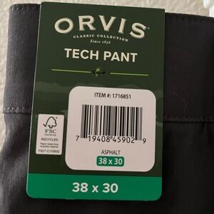 New Asphalt Gray Orvis tech pant. Two way stretch, water repellent, elastic in waistband, media storage. 38x30
