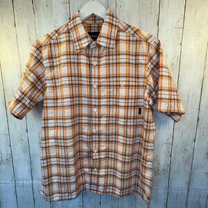 ORVIS Short Sleeve Button Down Shirt Mens Size M Orange White Linen Blend Plaid