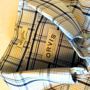 ORVIS 100% cotton blue plaid pattern mens shirt with chest pocket offers supreme comfort in a regular fit & easy to care cotton. Pre owned like new. Sz-M
