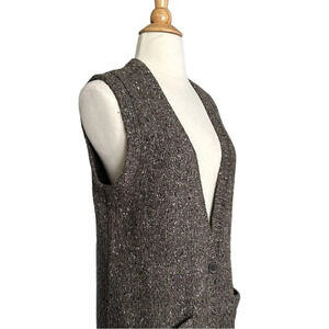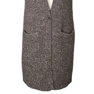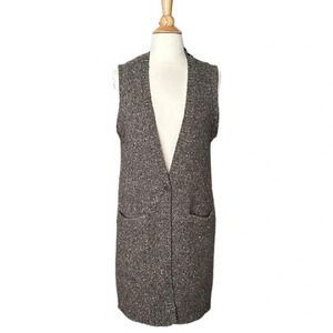 Warm, cozy, western, outdoors, festival, boho describe this neutral sleeveless long knit sweater vest. It features one button closure and front hand pockets. It’s gray with flecks of brown black & white. It falls well below the hips. Nice layering topper transition piece.