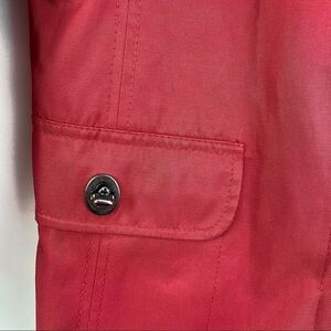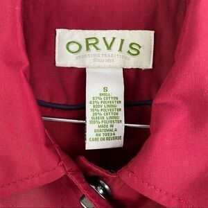 The Orvis Womens Long Jacket Style L2552 Rebel Red Small is a pre-owned, size small, cotton/poly blend jacket. It has a snap closure and built-in, non-removable shoulder pads.