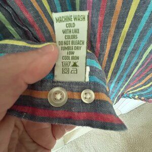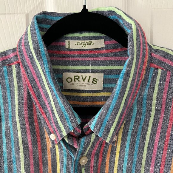 ORVIS men's striped long-sleeve linen shirt. This plus-size, multi-colored casual shirt has vertical stripes in yellow, orange, lime green, red, pinkish-red and 2 shades of blue against a dark blue background. Left chest buttoned pocket; button-down collar; 2 extra buttons sewn into seam near the fabric tag; curved bottom hem. This fun, breezy shirt needs a little ironing here and there, but is otherwise in excellent pre-loved condition.