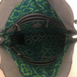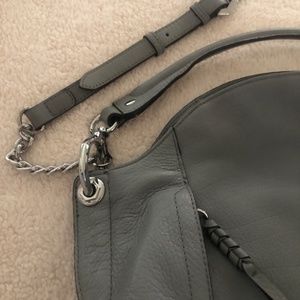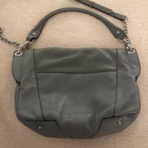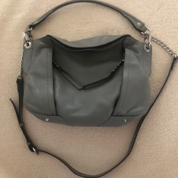 Beautiful gray leather, silver chain orYANY purse Brand new with tags . Dust cover included. 8 pockets - 2 zippered on front. One on back . 3 zippered pockets on inside . Cross body strap included . Shoulder strap attached with beautiful silver hardware .