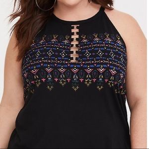 A shoulder-baring cutaway tank has O-ring details that lend this slimming top edgy appeal.