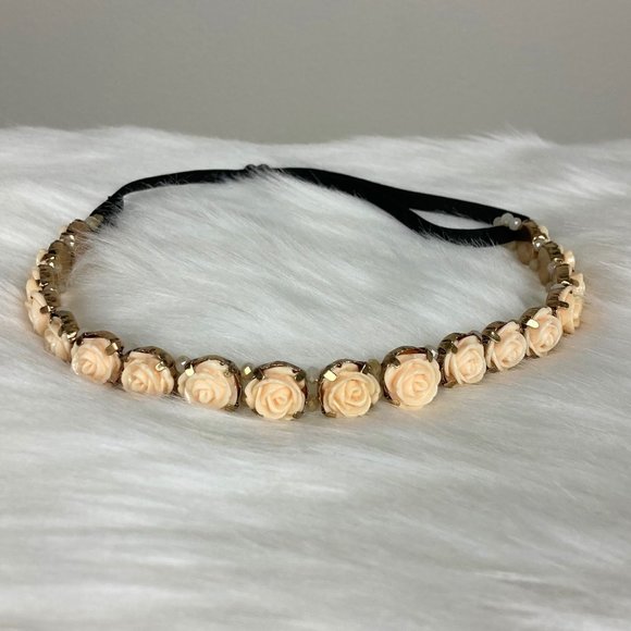 Peachy pink roses and iridescent white bead accents headband with black adjustable stretchy strap. One size.