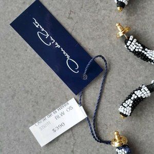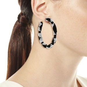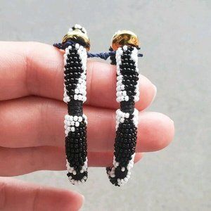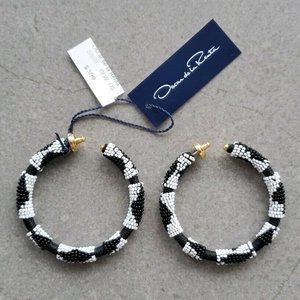 Description: Oscar de la renta beaded hoop earrings in a two tone black and white design. Brass hoop hardware and posts. Post backs for pierced ears. Glass and plastic seed beads. Post backs stamped 'Oscar de la Renta' and 'Made in India'. Light weight and comfortable to wear.